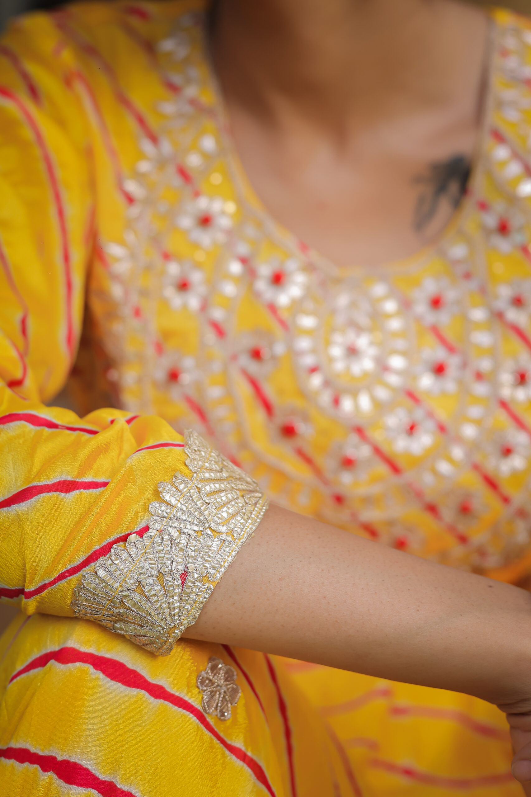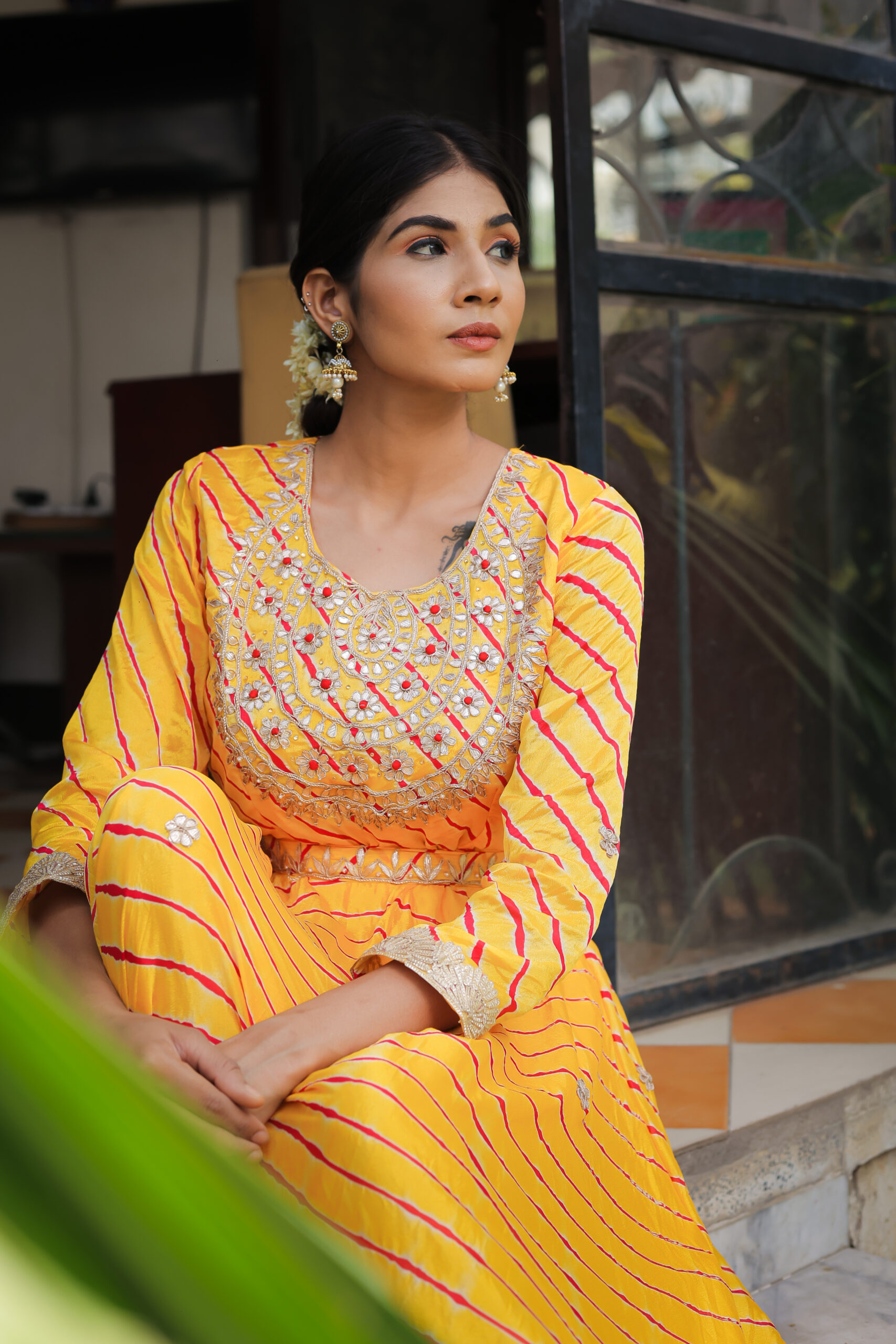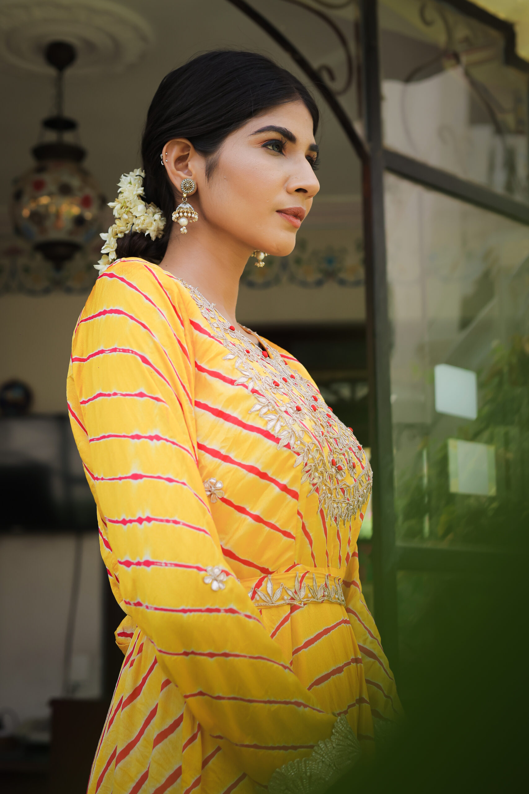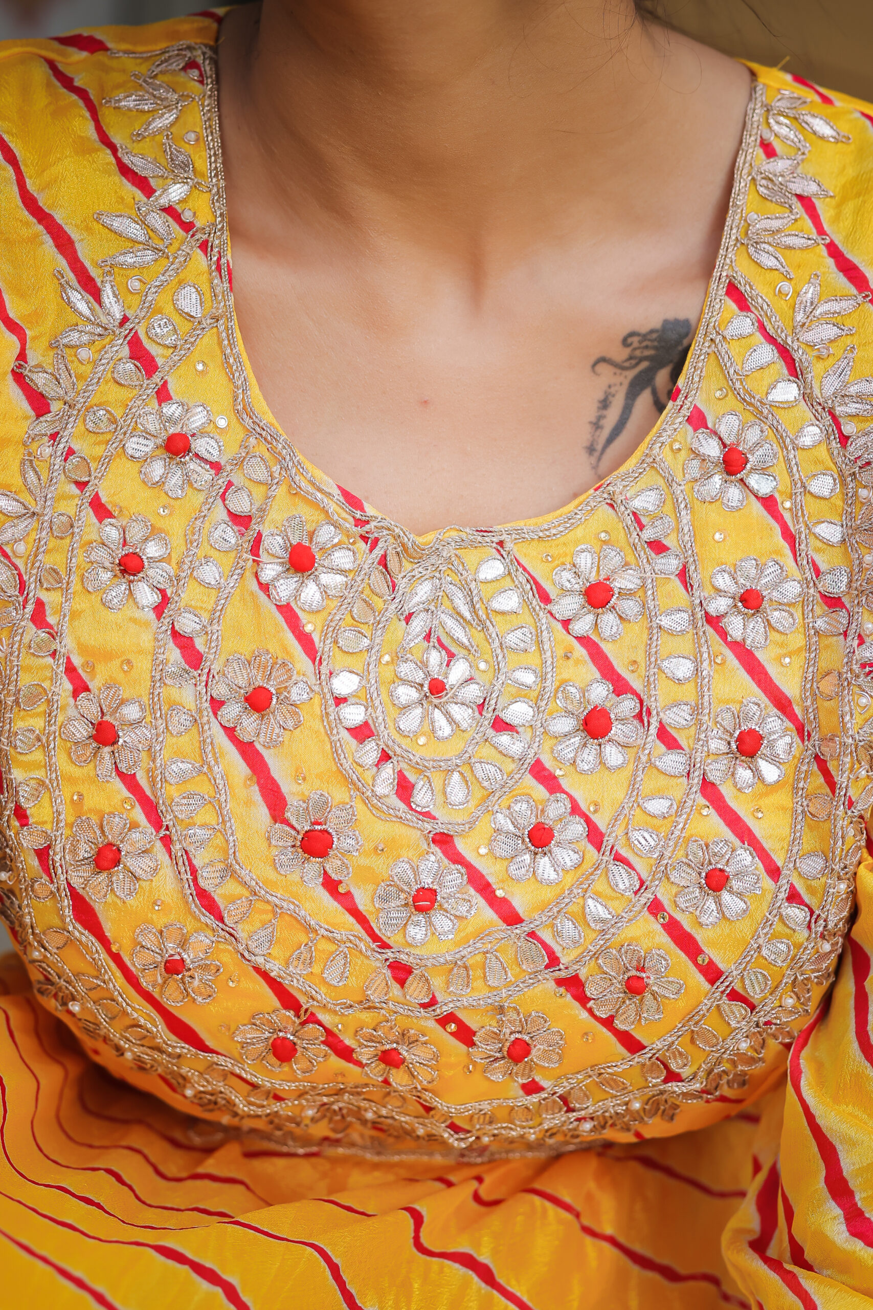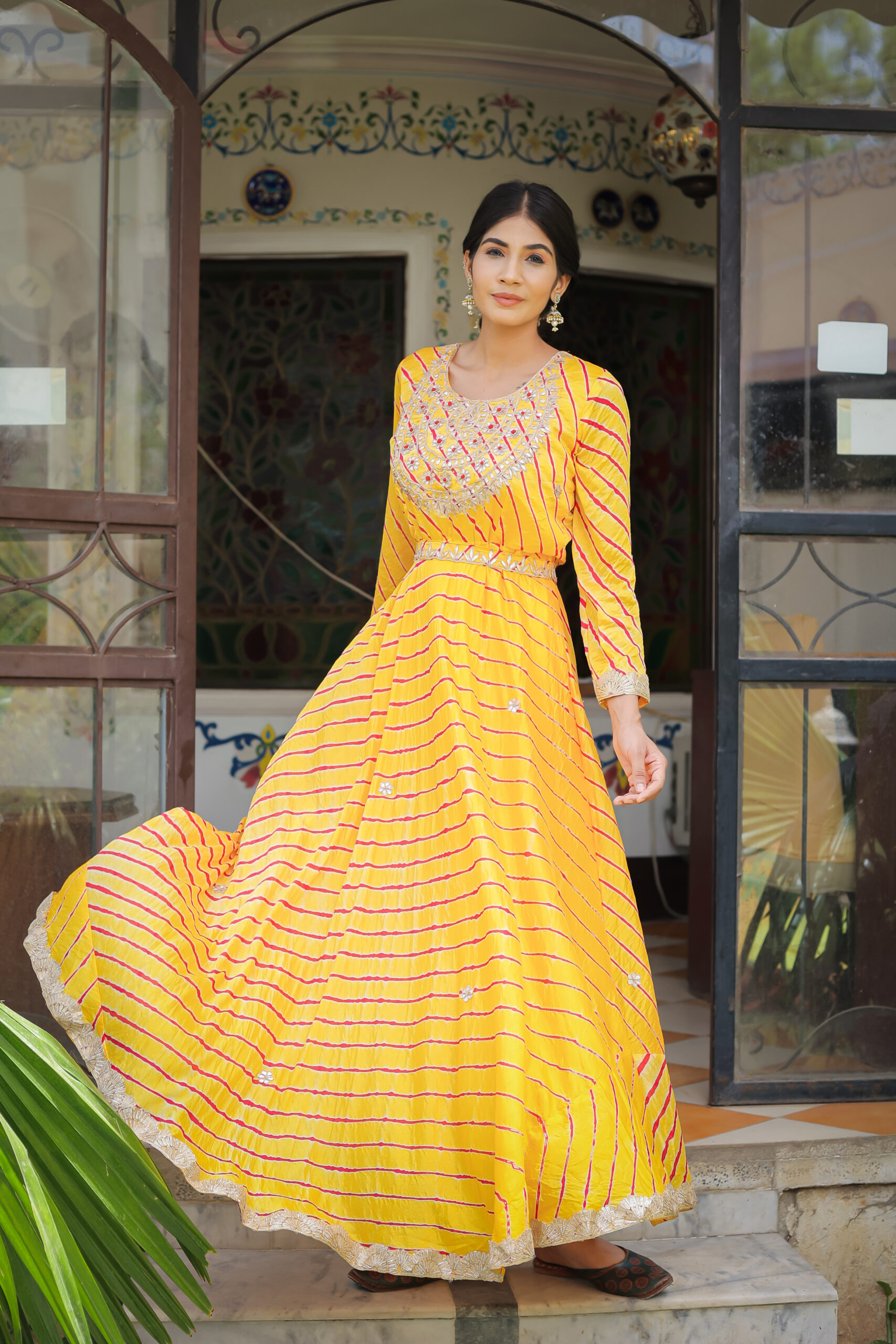 Grace meets tradition in this stunning long gown, crafted from premium art silk in a vibrant yellow hue. Designed in a classic Lehriya pattern, the gown features exquisite Gota Patti handwork adorning the neckline in an elegant necklace-style motif. Delicate lace detailing enhances the sleeves and bottom border, adding a refined touch to the ensemble. Perfect for festive occasions and celebrations, this gown blends heritage craftsmanship with contemporary elegance.